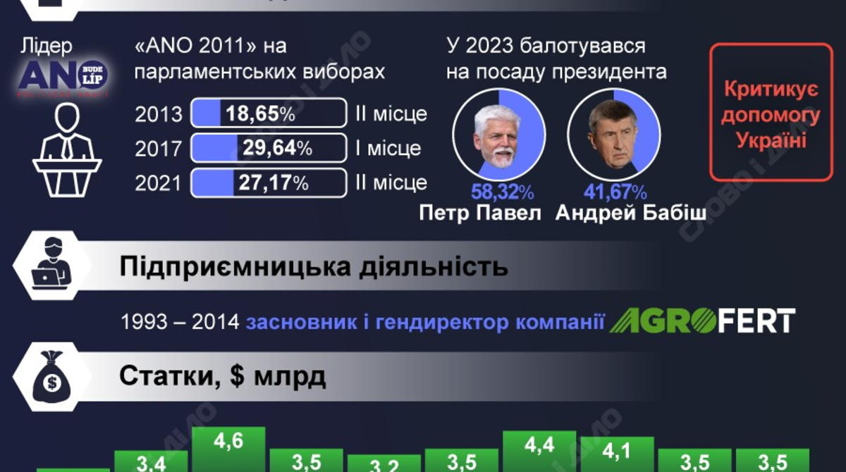 Майже за місяць до парламентських виборів у Чехії в рейтингах лідирує партія ANO експрем’єра Андрея Бабіша, якого у ЗМІ порівнюють зі скандальними «антиукраїнськими» прем'єрами Угорщини та Словаччини – Віктором Орбаном та Робертом Фіцо. Аналогія виникла через зовнішньополітичну орієнтацію ANO – члени партії майже не порушували тему воєнних злочинів диктатора володимира путіна в Україні та агресії росії. Навпаки – Бабіш висловився проти підтримки біженців з України, а також обіцяв скасувати чеську ініціативу щодо боєприпасів для української армії. Що відомо про лідера опозиції у Чехії Андрея Бабіша та рівень підтримки його партії станом на початок вересня – на інфографіці «Слово і діло».