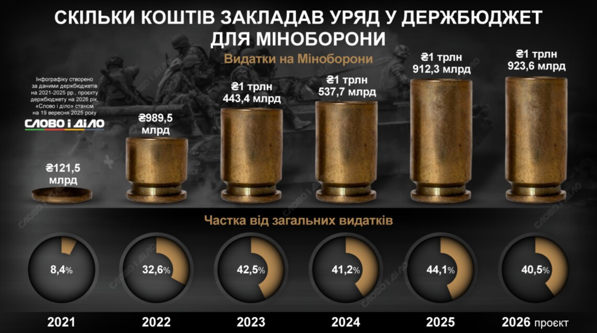 У 2025 році потреби Міністерства оборони оцінили у 1 трлн 912,3 млрд грн, що є майже половиною від всіх видатків бюджету – 44,1%.