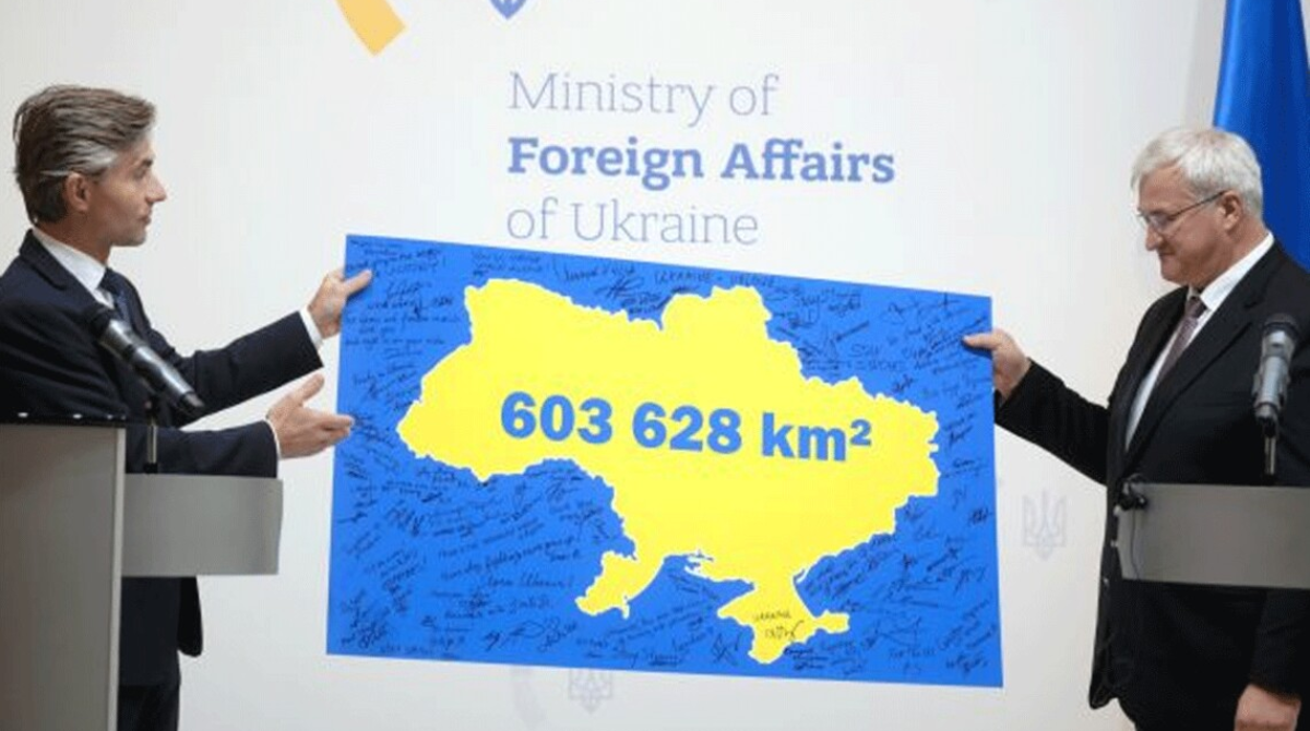 Зазначимо, під час візиту до Києва Кястутіс Будріс передав своєму українському колезі Андрію Сибігі символічний подарунок – карту України жовтим кольором без окупованих територій з позначкою 603 628 кв. км.