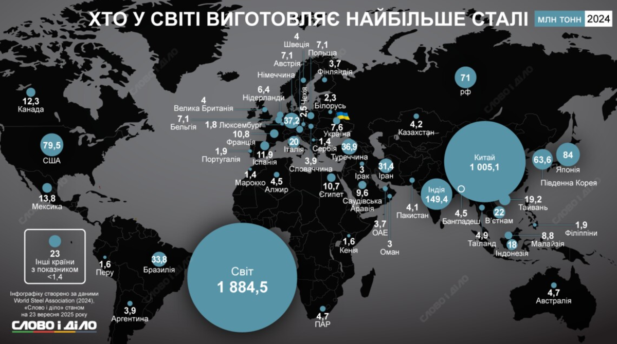 Згідно з даними за підсумками 2024 року, всього у світі виготовили 1 млрд 884,5 млн тонн сталі.