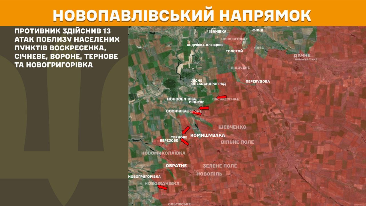 На Новопавлівському напрямку противник здійснив 13 атак поблизу населених пунктів Воскресенка, Січневе, Вороне, Тернове та Новогригорівка.