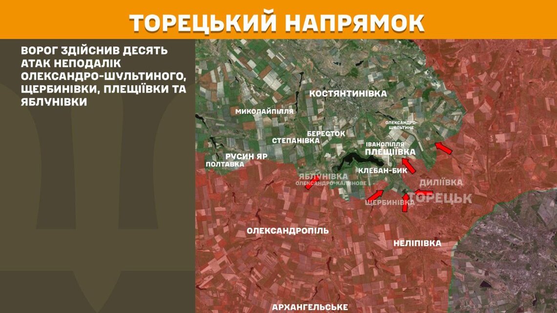На Торецькому напрямку ворог здійснив десять атак неподалік Олександро-Шультиного, Щербинівки, Плещіївки та Яблунівки.