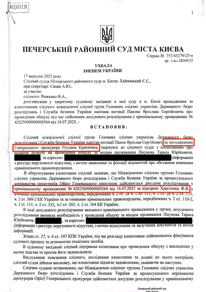 При цьому Центр наводить повний текст ухвали про обшук в орендованій квартирі, де мешкає Лікунов. Зазначається, що клопотання про проведення обшуку погоджував особисто Генеральний прокурор України Руслан Кравченко.