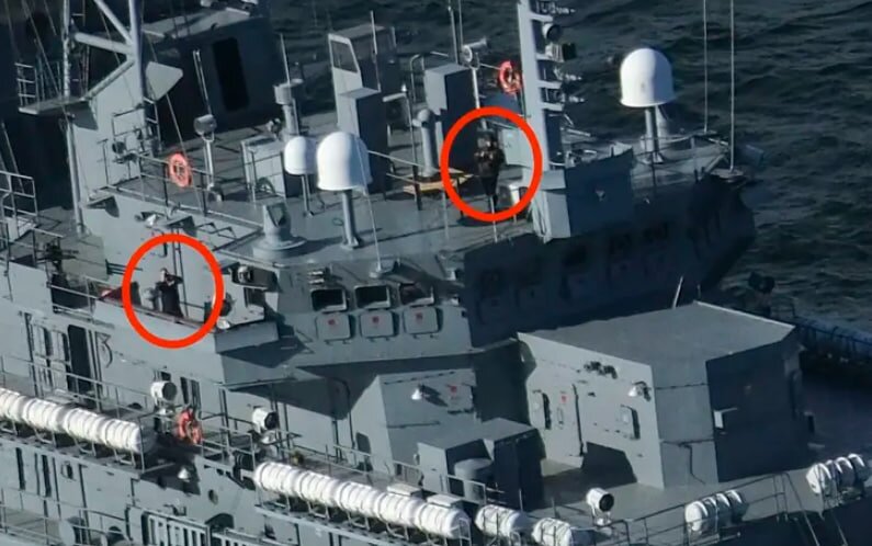 Після появи гелікоптера корабель почав рухатися на схід. На палубі було помічено двох військових, які, ймовірно, спостерігали та знімали літальний апарат.