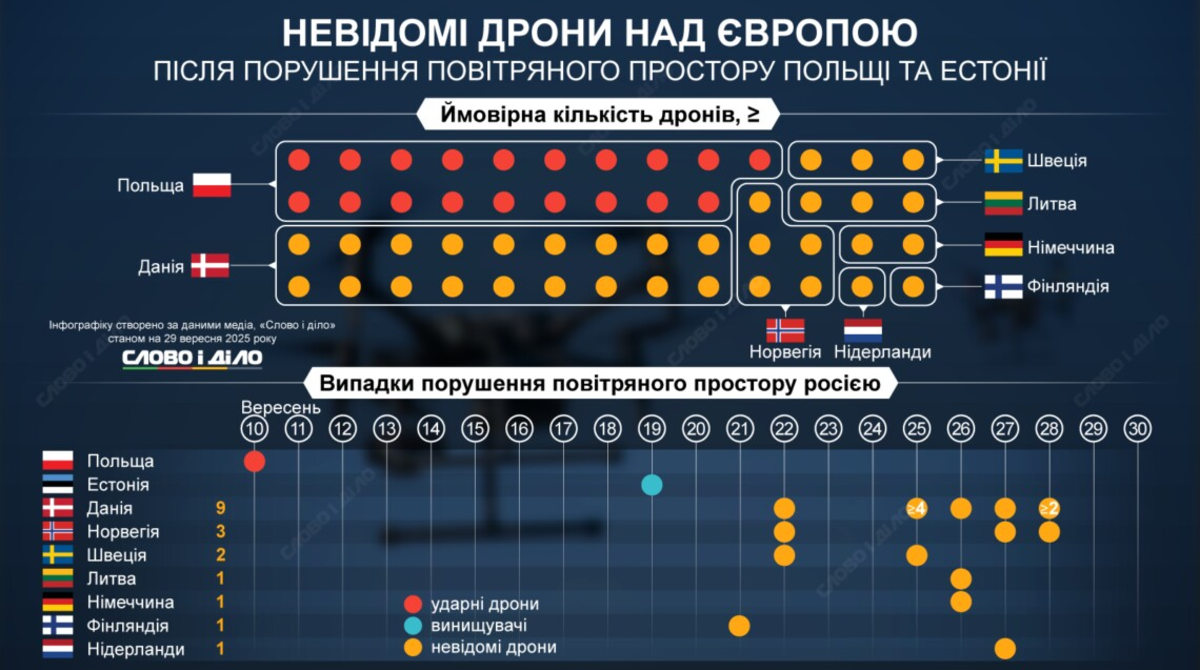 У небі Європи протягом останніх двох тижнів почали з'являтися невідомі дрони – країни вимушено призупиняють роботу аеропортів, піднімають у небо свої винищувачі або навіть розвертають авіарейси. Найбільшу кількість «невідомих дронів» у вересні зафіксували над Данією, а також над Норвегією та Швецією. Президент Володимир Зеленський заявив, що росія використовує танкери для запуску дронів по країнах Європи, однак у самому Кремлі вже традиційно відкидають будь-яку причетність до БПЛА над європейськими країнами, а також запевняють, що їх винищувачі «не порушували кордонів інших країн». На інфографіці «Слово і діло» – скільки дронів зафіксували в небі країн Європи у вересні та що відомо про самі інциденти.