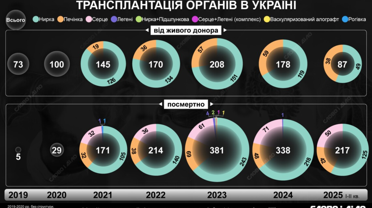 Згідно з даними Українського центру трансплант-координації, у 2019 році в Україні провели 73 операції з пересадки органів від живого донора, і ще п'ять – посмертно. У 2020 році лікарі виконали 100 трансплантацій, посмертно – 29. Структура трансплантацій (пересаджені органи) за ці роки не розголошується.