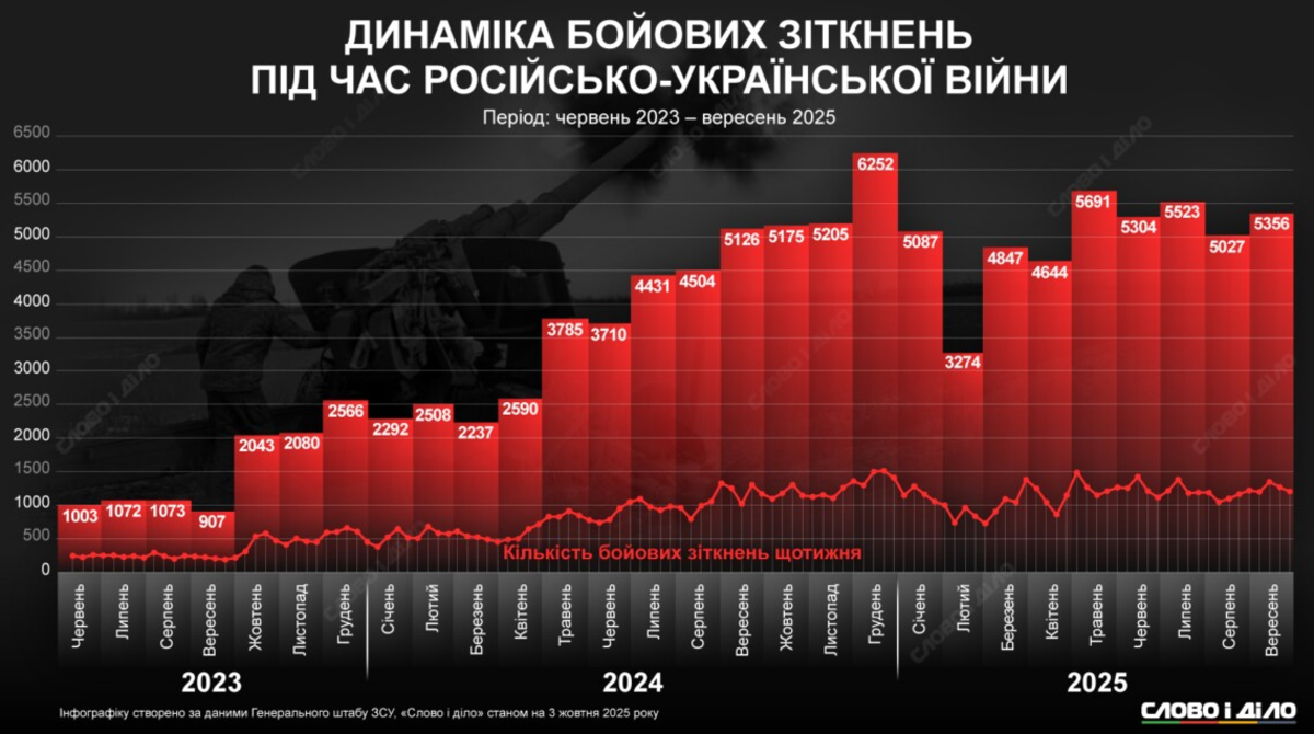 Найкривавішим за останні два роки досі залишається грудень 2024 року. Тоді щодоби відбувалося в середньому понад 200 бойових зіткнень, а загальна кількість за місяць сягнула рекордних 6252 боїв.