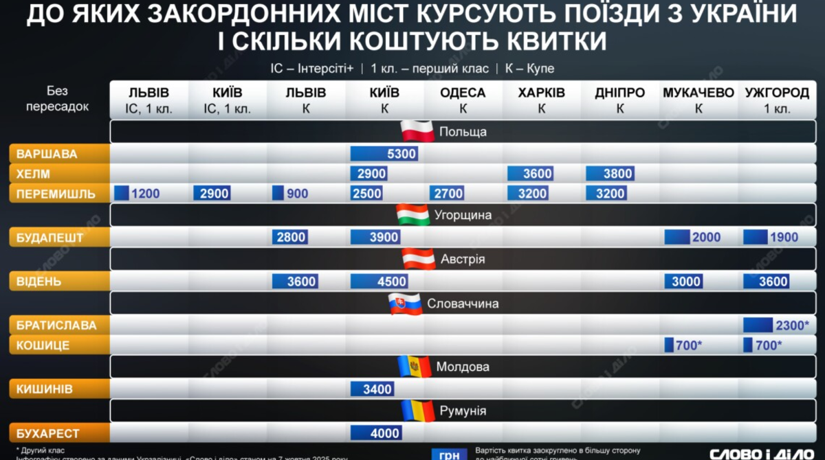 З 10 жовтня з України курсуватиме новий поїзд міжнародного сполучення за маршрутом Київ – Бухарест. Рейс виконуватиметься щоденно та пролягатиме через Київ, Вінницю, Жмеринку, Могилів-Подільський, Велчинець, Унгени, Ясси та столицю Румунії. А з 12 вересня Укрзалізниця запустила з Ужгорода перші потяги євроколією до столиць Європейського Союзу – Братислави, Будапешта й Відня. «Слово і діло» на інфографіці вирішило показати, з яких українських міст і до яких закордонних країн курсують без пересадки поїзди УЗ та скільки коштуватиме квиток.
