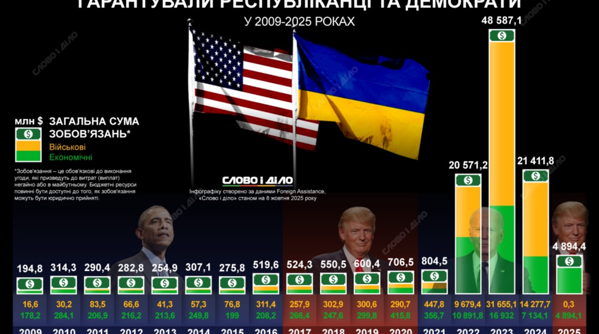 Підтримка України з боку США не припинилася у поточному році під час другої каденції республіканця Дональда Трампа, хоча змінилася її орієнтованість – з військової на економічну. Влітку у Білому домі заявили, що більше не даватимуть Україні гроші на війну, а постачання озброєння мають фінансувати європейські країни. Тоді була створена і запрацювала ініціатива PURL. Водночас рекордними за останні 16 років були виплати від США за часів президентства демократа Джо Байдена, а саме у 2023-му – на другий рік повномасштабного вторгнення росії. Також Білий дім надавав підтримку Україні й за часів президента-демократа Барака Обами. На інфографіці «Слово і діло» – як змінювалася підтримка України з боку США за республіканців та демократів з 2009 по 2025 рік.
