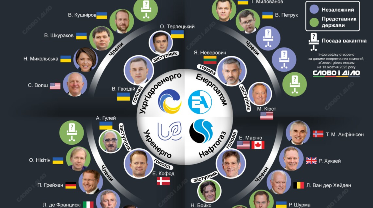 Наглядова рада «Укренерго» після консультацій з Міненерго погодилась залишити Віталія Зайченка головою правління компанії, таким чином закривши питання кадрового конфлікту, що виник у вересні. Нині у трьох з чотирьох найбільших енергетичних компаній України наглядові ради очолюють іноземці, яким Кабмін свого часу передав повноваження для «підвищення довіри до України на Заході, а також задля покращення економічних показників підприємств». Серед членів наглядової ради «Енергоатома» три з семи посад поки що залишаються вакантними. Стосовно інших енергетичних компаній – «Нафтогаз», «Укренерго», «Укргідроенерго» – вільних місць по одному або немає зовсім. Хто входить до складу наглядових рад найбільших енергетичних компаній України – на інфографіці.