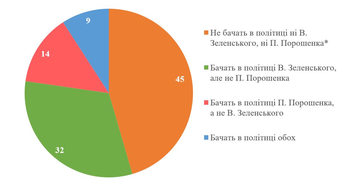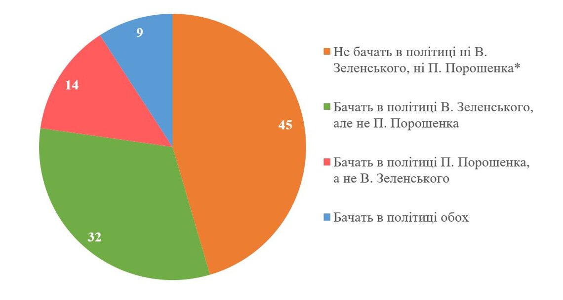 Якщо об’єднати відповіді щодо обох політиків, 45% респондентів не бачать після війни ані Зеленського, ані Порошенка у політичному житті, ще 46% готові підтримати одного з них, але не обох одночасно.