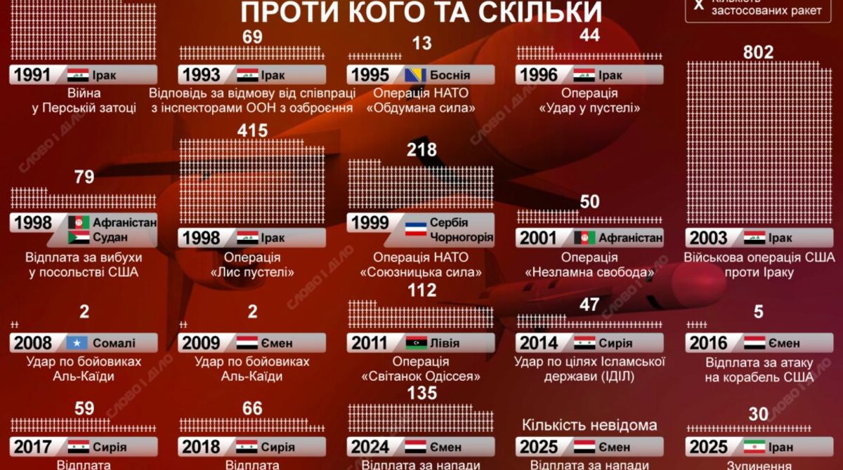 Україна максимально наблизилася до отримання американських далекобійних ракет Tomahawk, дальність яких може сягати 2500 км. Остаточне рішення про передачу в США ще не ухвалили, однак очікується, що це питання президент України Володимир Зеленський та голова Білого дому Дональд Трамп порушать 17 жовтня у Вашингтоні. Трамп попереджав, що може повідомити російського диктатора путіна про намір передати Україні Tomahawk, якщо найближчим часом не буде досягнуто врегулювання війни. Військові США застосовують ракети Tomahawk з 1991 року, наймасовіше – під час операцій в Іраку. Цього року за наказом Дональда Трампа військові США вдарили Tomahawk по ядерних об'єктах Ірану. «Слово і діло» вирішило подивитися, проти кого США застосовували крилаті ракети Tomahawk з 1991 по 2025 рік та якою була їхня кількість.