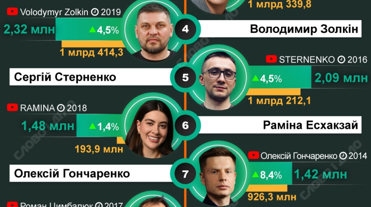 Аналітики «Слово і діло» вчетверте склали рейтинг українських YouTube-блогерів з найбільшою кількістю підписників, які публікують контент на тематику, пов'язану з війною. Лідерами за кількість підписників залишаються Дмитро Гордон, Дмитро Комаров, Володимир Золкін та Сергій Стерненко. Однак цього року зі списку вибув Олексій Арестович – його відеоканали у травні заблокували через санкції. Водночас вперше потрапив до рейтингу Тарас Березовець. Як за рік змінилася кількість підписників у найпопулярніших YouTube-блогерів, які висвітлюють теми війни рф проти України – на інфографіці.