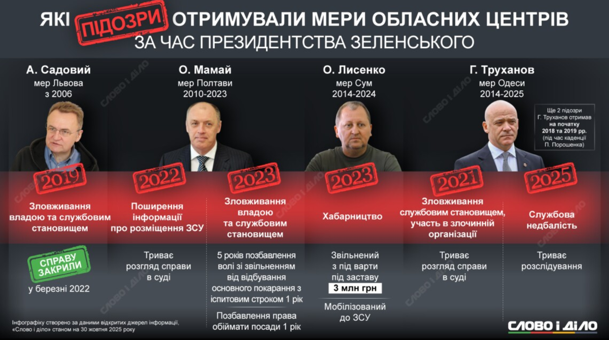 Колишнього міського голову Одеси Геннадія Труханова підозрюють у службовій недбалості, що призвела до загибелі людей під час масштабних підтоплень міста у вересні цього року. Прокуратура під час обрання запобіжного заходу, попередньо, проситиме для ексмера цілодобовий арешт. Це вже друга підозра Труханова за останні п'ять років, попередня стосувалася зловживання службовим становищем. «Слово і діло» вирішило згадати, хто з мерів обласних центрів отримував підозри або адмінпротоколи протягом останніх шести років.