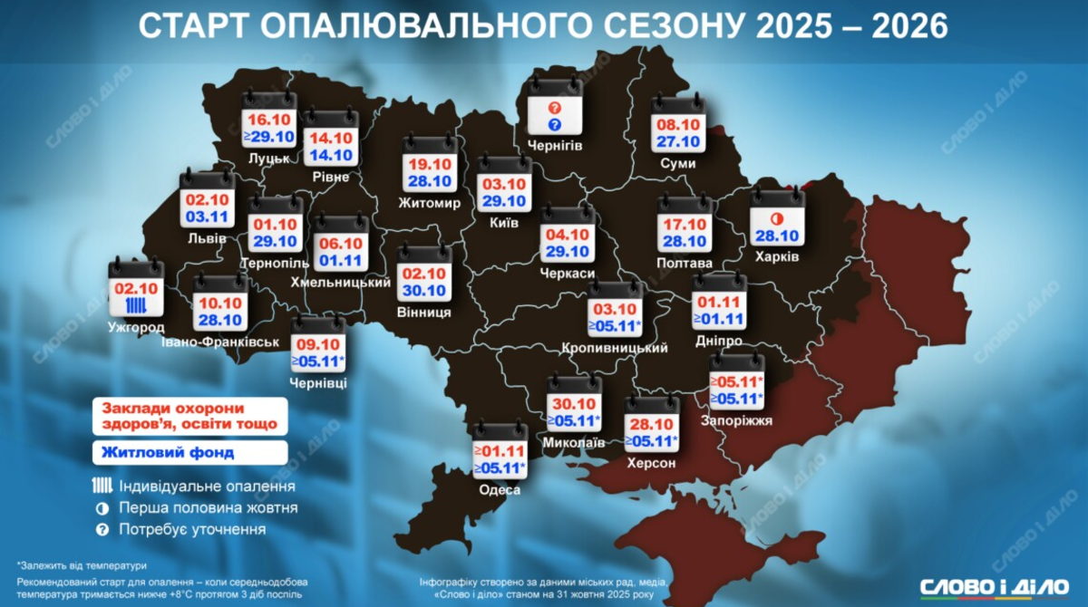 Україна розпочала четвертий опалювальний сезон в умовах повномасштабної війни. Попри посилені атаки росіян на енергетику та теплогенеруючі обʼєкти у вересні та жовтні, більшість обласних центрів протягом цього тижня все ж почали обігрівати домівки українців. Рішення увалювали з урахуванням похолодання, а також для зниження навантаження на енергосистему, яке причинило використання обігрівачів. Лікарні, дитсадки та школи, традиційно, отримали теплі батареї раніше. На інфографіці «Слово і діло» – коли в найбільших містах України розпочався опалювальний сезон 2025-2026.