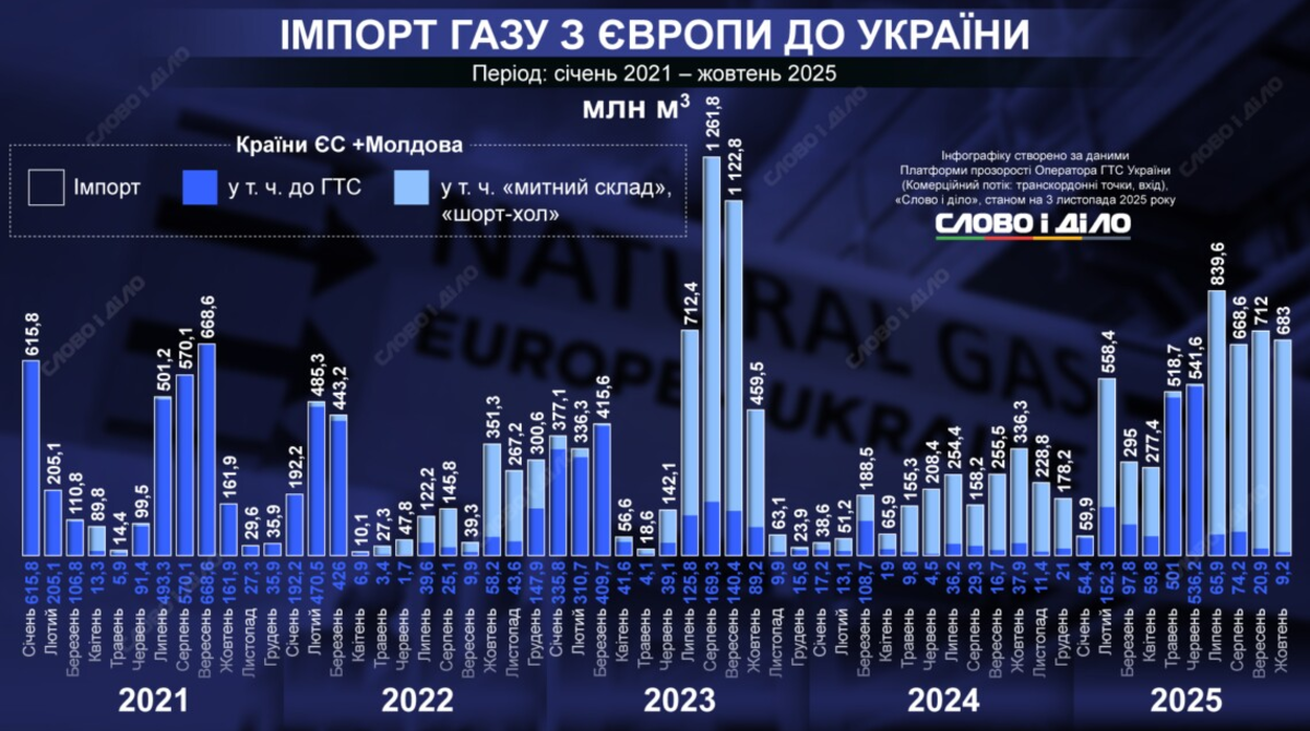 У січні 2025 року Україна імпортувала лише 59,9 млн кубометрів, у лютому обсяг імпорту зріс до 558,4 млн кубів. У березні – 295 млн кубометрів. З квітня по липень поточного року Україна суттєво збільшила імпорт газу: квітень – 277,4 млн кубометрів, травень – 518,7 млн кубометрів, червень – 541,6 млн кубометрів. У липні вперше від початку року показник досяг 839,6 млн кубометрів. У серпні обсяги імпорту становили – 668,6 млн кубометрів. У вересні зросли до 712 млн, а у жовтні становили 683 млн кубометрів.