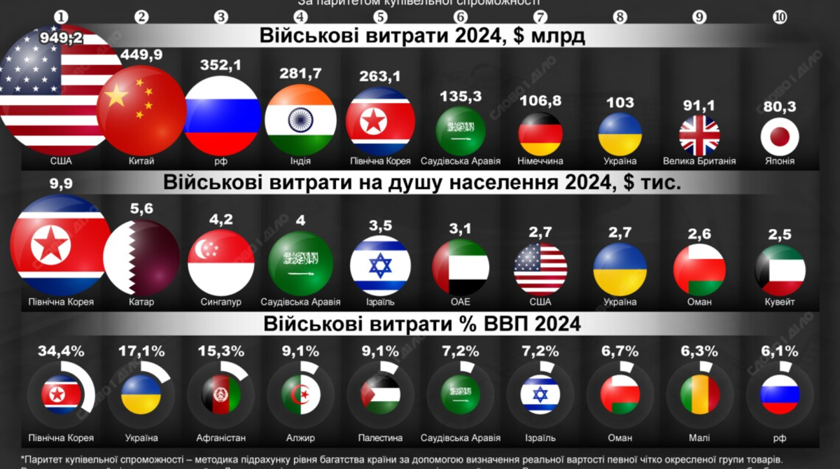 Найбільші військові витрати за паритетом купівельної спроможності за підсумками минулого року мали США – 949,2 млрд доларів. На другому місці Китай – 449,9 млрд доларів, на третьому – росія (352,1 млрд доларів). Також чимало витрачають Індія та Північна Корея – 281,7 та 263,1 млрд доларів відповідно. На шостому місці – Саудівська Аравія (135,3 млрд доларів), за нею – Німеччина 106,8 млрд доларів.