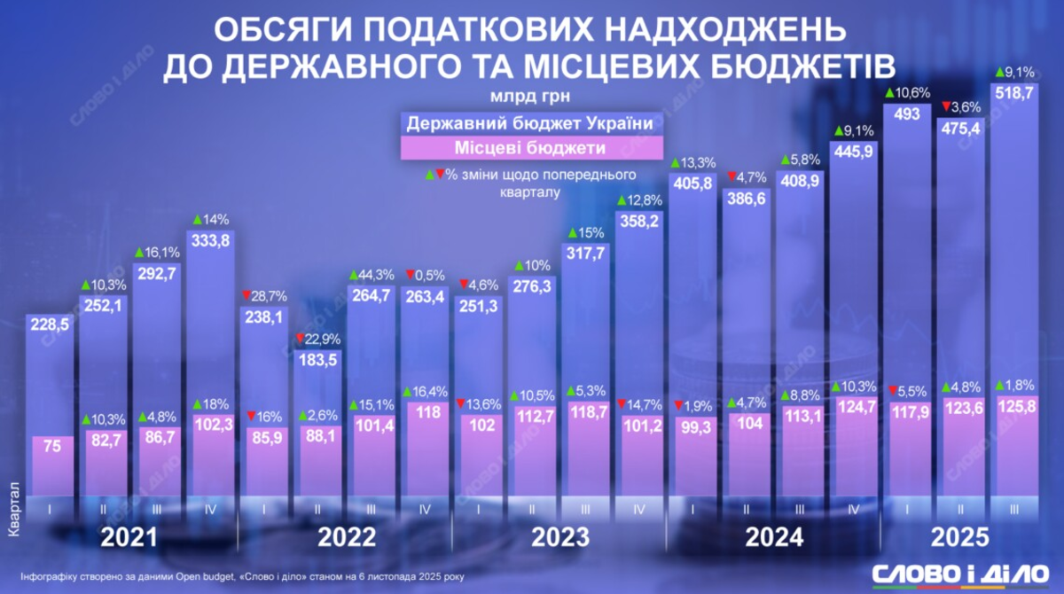 Податкові надходження до державного бюджету суттєво зросли за минулий і поточний роки. У 2024-му відбулося значне підвищення податків, яке влада пояснила необхідністю наповненням бюджету та скорочення його прогресуючого дефіциту, а також вимогами кредиторів. Основні зміни стосувалися збільшення військового збору з 1,5% до 5%, а також підвищення податку на прибуток для банків. Основну частину податкових надходжень, зокрема військовий збір, Україна витрачає на безпеку та оборону, що є пріоритетом на тлі агресії рф. Інша частина податку, зокрема, на доходи фізичних осіб (ПДФО) надходить до місцевих бюджетів. «Слово і діло» вирішило порівняти, як змінилися обсяги податкових надходжень до державного та місцевих бюджетів з 2021 по 2025 рік.
