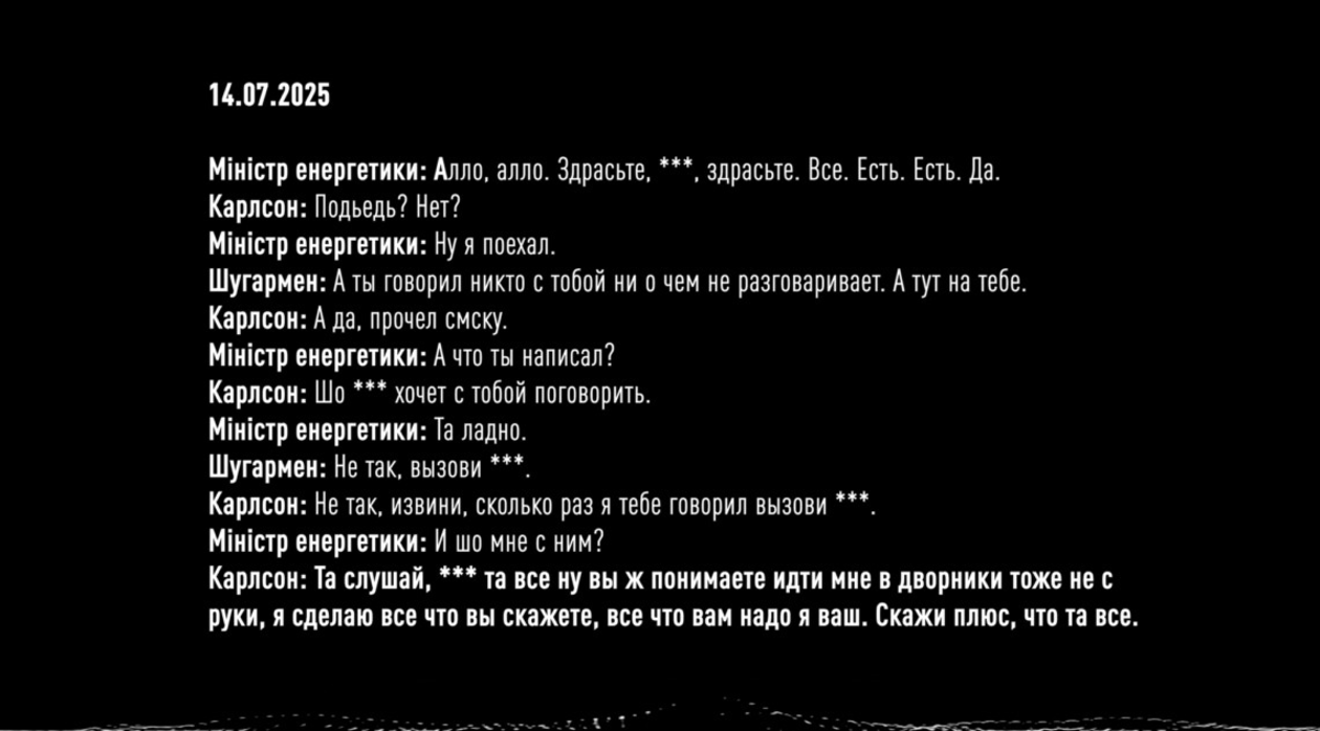 Зокрема, на цих записах, датованих 14 липня 2025 року, зафіксована розмова міністра енергетики (на той момент цю посаду обіймав Герман Галущенко – ред.) з ймовірним керівником злочинної організації («Карлсон»). За інформацією медіа та джерел «Слово і діло», може йтись про власника студії «Квартал 95» Тимура Міндіча.