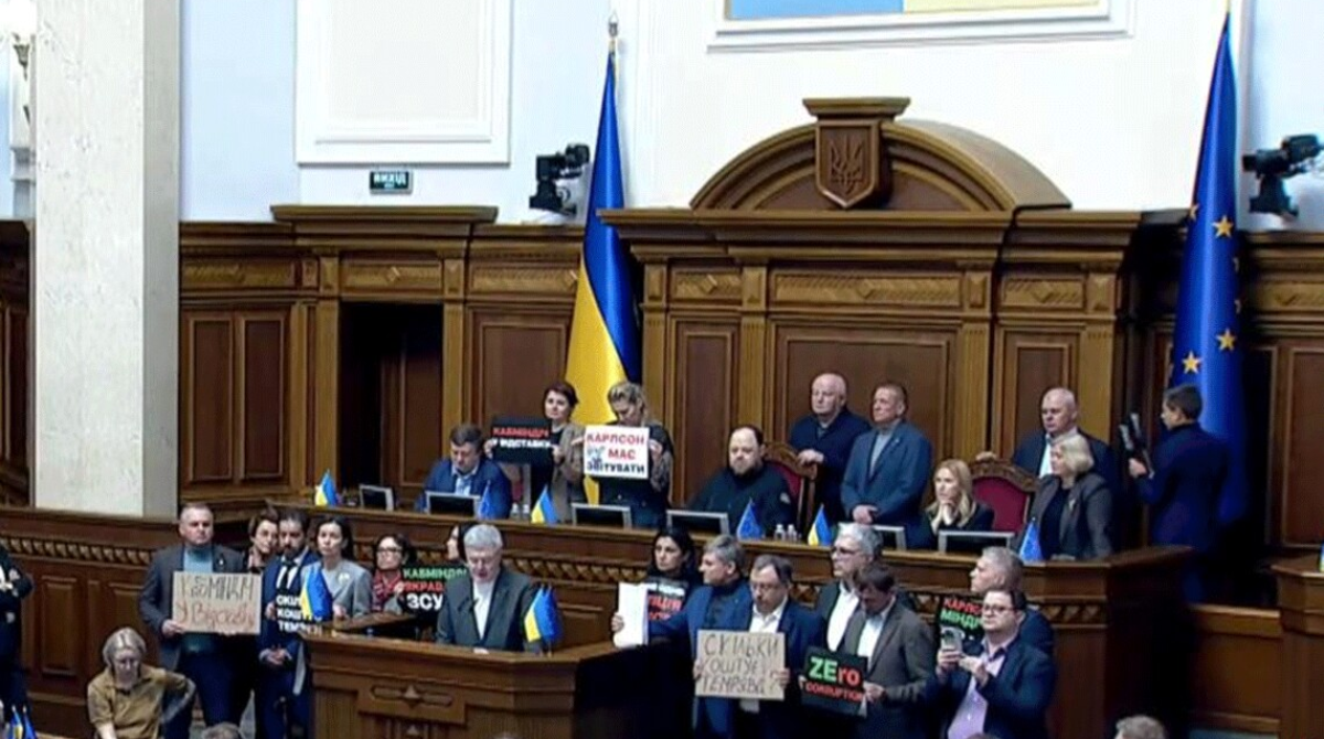 У парламенті у вівторок зірвалося засідання, на якому мали розглянути відставку міністра юстиції Германа Галущенка та міністерки енергетики Світлани Гринчук, які потрапили у корупційний скандал. Нардепи заблокували трибуну.
