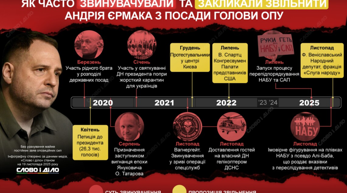 Під правою рукою Володимира Зеленського Андрієм Єрмаком знову похитнулося крісло голови Офісу президента. Цього разу причиною стали чутки, що на скандальних «плівках Міндіча» людина на прізвисько «Алі-Баба», яка роздає вказівки щодо атак на САП і НАБУ, є сам Андрій Єрмак. Як заявив нардеп Федір Веніславський, тему звільнення голови ОПУ обговорюють і підтримують й самі «слуги народу». Однак це далеко не перший випадок, коли у ЗМІ починають активно обговорювати можливу відставку Єрмака або висловлюють публічні звинувачення, зокрема – ситуація з призначенням своїм заступником вигнанця часів Януковича Олега Татарова, святкування дня народження під час карантину або з гелікоптером ДСНС чи ймовірна причетність до зриву затримання «вагнерівців». «Слово і діло» вирішило за допомогою інфографіки показати, як часто публічно звинувачували та закликали звільнити Андрія Єрмака з посади голови ОПУ.