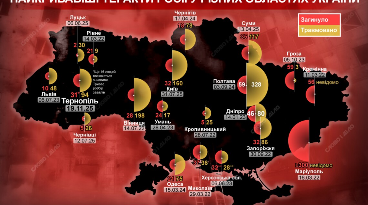 Україна оговтується від кривавого удару росіян по житловій багатоповерхівці у Тернополі, де, за останніми даними, загинула 31 людина та понад 90 – постраждали. Пошукові роботи тривають й досі. Ще більше людей загинули цьогоріч внаслідок російського удару по житловому будинку у Святошинському районі Києва у липні та після ракетної атаки рф на середмістя Сум у квітні. Однак за чотири роки великої війни найжорстокішим та найсмертоноснішим залишається теракт росії у Маріуполі – удар по драматичному театру, де загинуло одночасно приблизно 300 людей, в тому числі діти. «Слово і діло» вирішило показати на карті наймасштабніші теракти російських військових у різних регіонах України за майже чотири роки вторгнення.