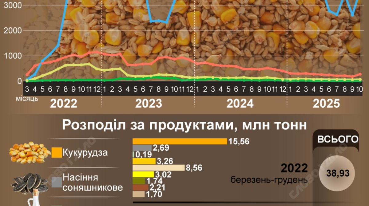 З січня по жовтень 2025 року Україна експортувала лише 37,35 млн тонн зернових – це майже вдвічі менше, ніж тогоріч і приблизно стільки ж, як з березня по січень 2022 року. Традиційно, найбільше продали кукурудзи – 13,53 млн тонн та пшениці – 11,76 млн тонн. Також від початку відправили на імпорт: 3,50 млн тонн соняшникової олії, 2,64 млн тонн шроту, 1,35 млн тонн ріпаку, 1,37 млн тонн ячменю, 2, 71 млн тонн соєвих бобів, 0,44 млн тонн соєвої олії та лише 0,05 млн тонн соняшникового насіння.