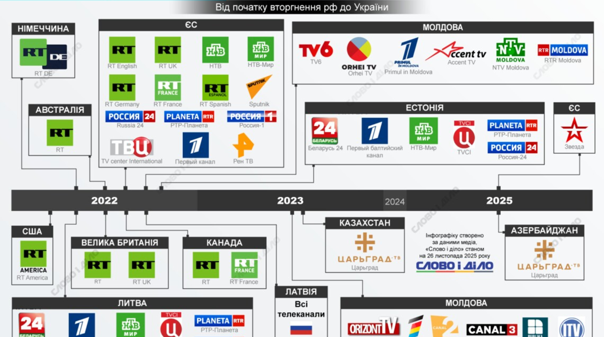 Україна була однією з перших країн, яка у 2014 році через пропаганду війни заборонила російські пропагандистські телеканали: Russia Today,«НТВ», «Россия-24», «Первый канал», «Россия-1», «Звезда», Life News і кілька інших.
