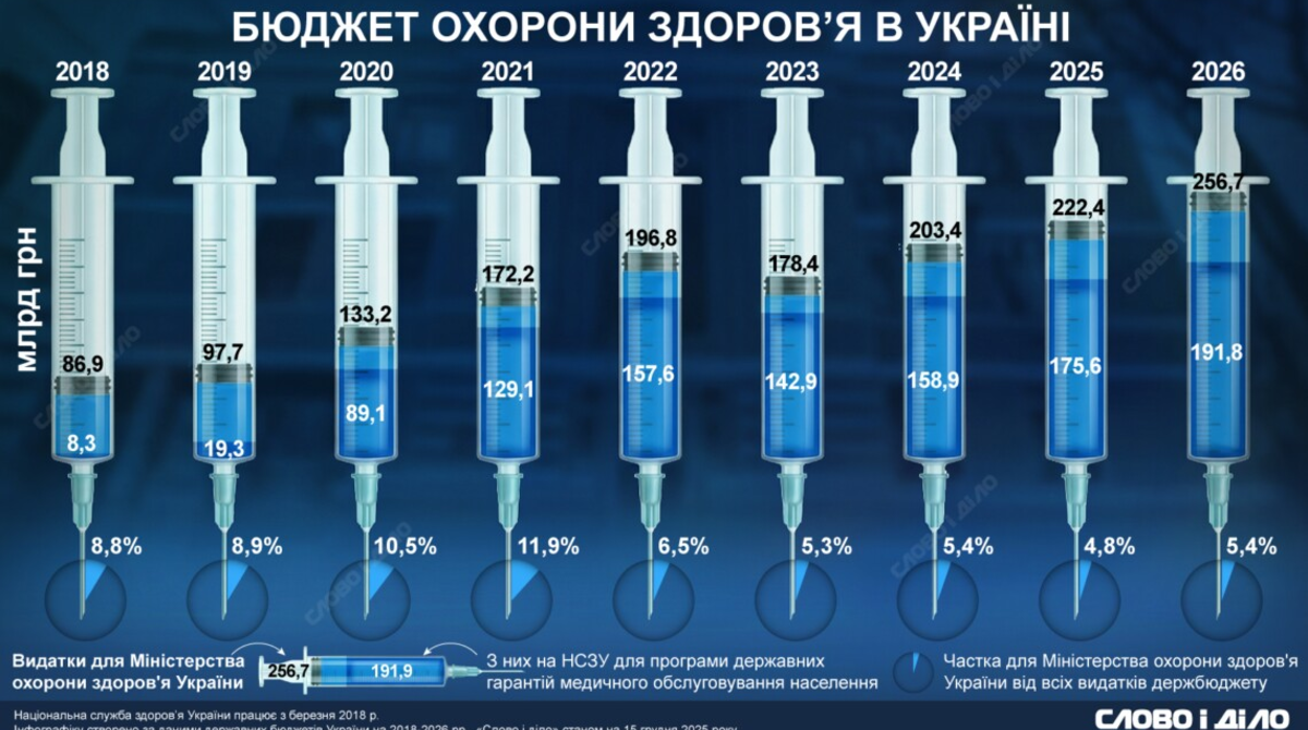 У держбюджеті-2026 на охорону здоров'я заклали 256,7 млрд грн. Це на 15,4% більше, ніж минулого року, і найбільше з 2018 року. З загальної суми більша частина грошей буде спрямована на Програму медичних гарантій (підвищення зарплат лікарів первинної та екстреної допомоги до 35 тисяч грн; лікування військових, реабілітація, лікування важких травм та опіків, кардіохірургія, онкологія). Частину коштів витратять на безкоштовні ліки для громадян, які мають хронічні захворювання.