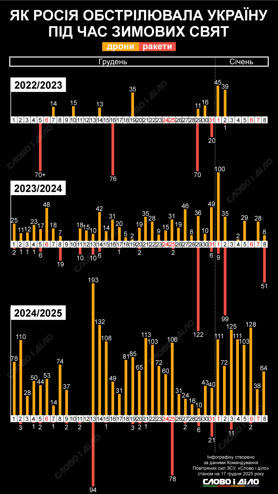 Водночас кількість запущених дронів у грудні була найбільшою, у порівнянні з попередніми роками – 1850. Зокрема, на День святого Миколая – 53 БПЛА, на святвечір та Різдво 24-25 грудня – 60 і 106 безпілотників відповідно, 31 грудня – 40 БПЛА. За перший тиждень поточного року російські війська атакували Україну дронами кожної ночі. Наймасовіше: 1 та 4 січня – 111 безпілотників, 3 січня – 125, 6 січня – 128.