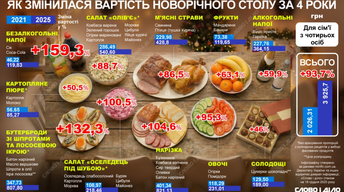 Всього новорічний стіл з 2021 по 2025 рік подорожчав в середньому з 2 026 до 3 925 грн – на +93,7%.