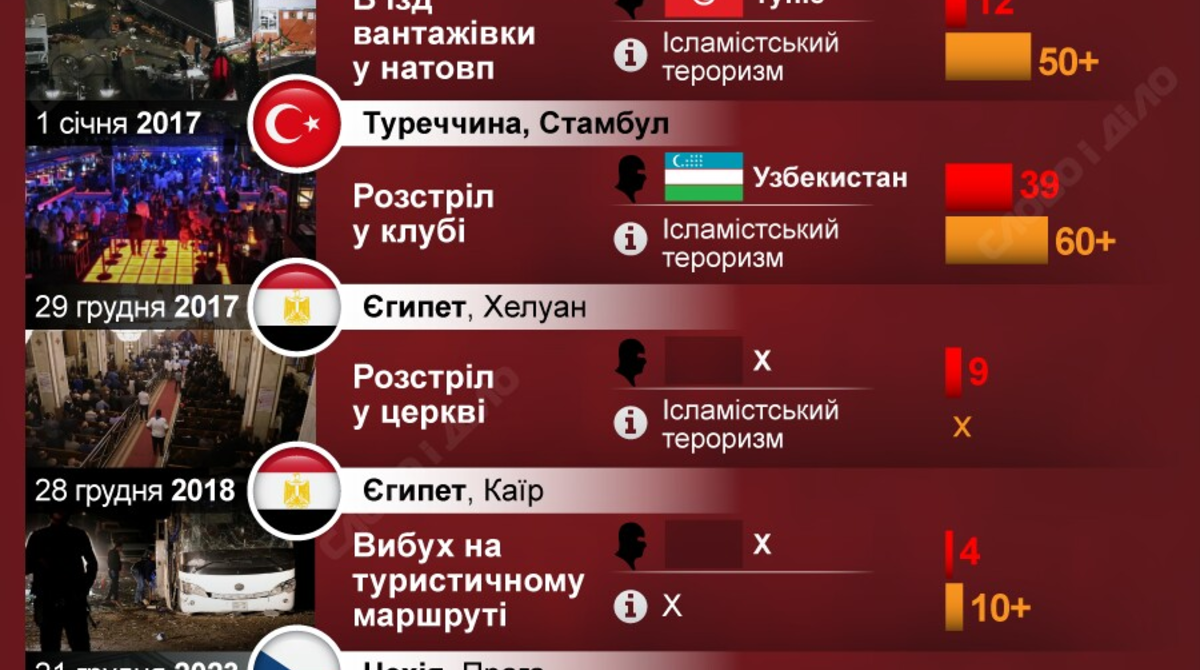 Новорічні та різдвяні святкування 2025-2026 лише розпочинаються, а у деяких країнах світу вже відбулися кровопролитні теракти, внаслідок яких загинули або зазнали поранень десятки людей. Найгучнішим від початку грудня став антисемітський теракт на пляжі Бонді в Сіднеї: двоє терористів відкрили по людях вогонь під час святкування Хануки. Загинули щонайменше 16 осіб, в тому числі й один з нападників. Також серед жертв – 10-річна дитина. Ще цього місяця у німецькій Баварії заарештували підозрюваних у плануванні теракту на різдвяному ярмарку. А у Сполучених Штатах сталася стрілянина у Браунському університеті та студентському гуртожитку штату Кентуккі. «Слово і діло» на інфографіці згадало й інші випадки вчинення терактів в період різдвяно-новорічних святкувань у країнах світу.