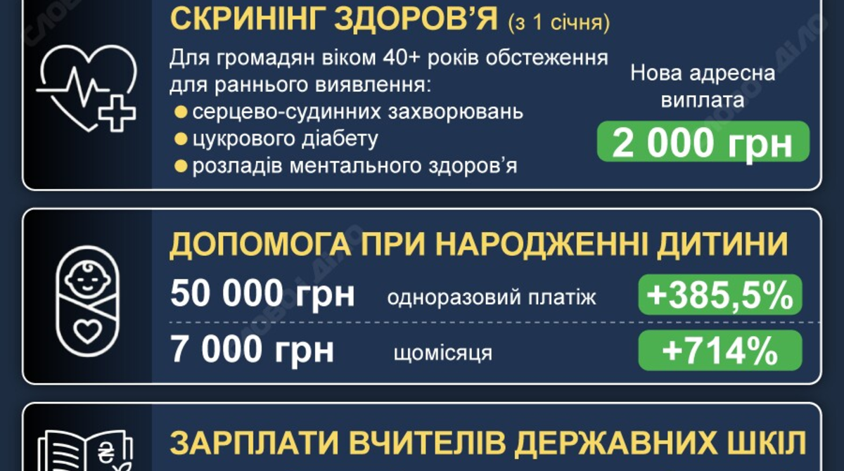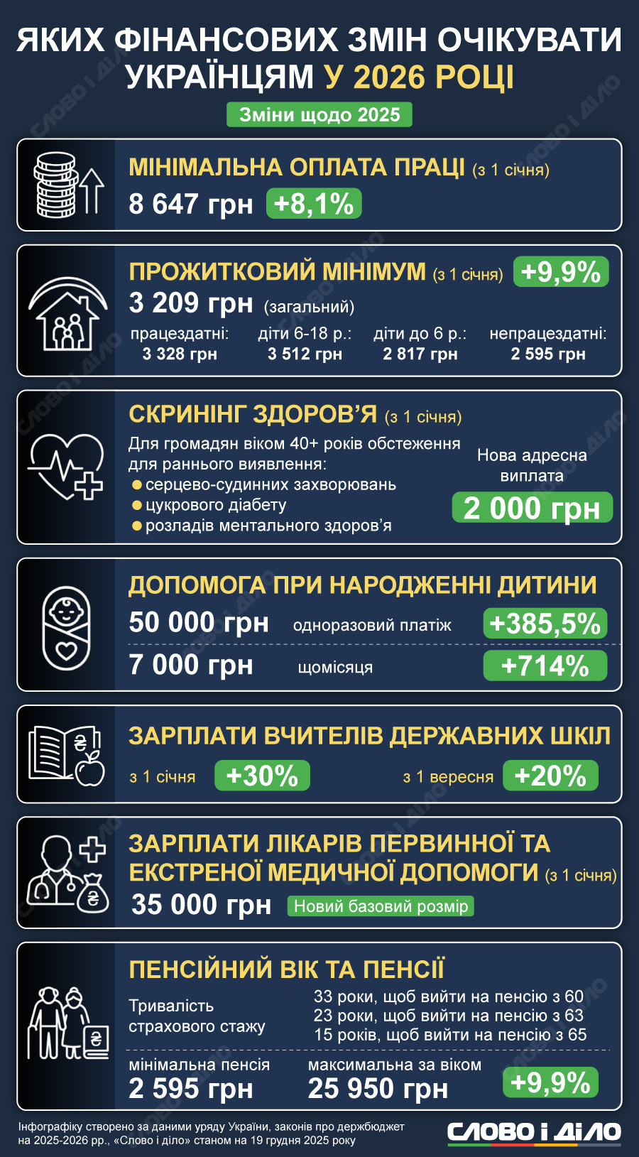 Наступного року на українців чекатиме підвищення соціальних стандартів. Вже з 1 січня зросте мінімальна заробітна плата та прожитковий мінімум. Вперше з 2014 року український уряд переглянув виплати при народженні дитини, збільшивши їх до 50 тисяч грн, а щомісячну допомогу – до 7 тисяч. Також зростуть зарплати у вчителів та лікарів первинної та екстреної медичної допомоги. Детальніше про ці та інші зміни, які заклали у державний бюджет – на інфографіці «Слово і діло».
