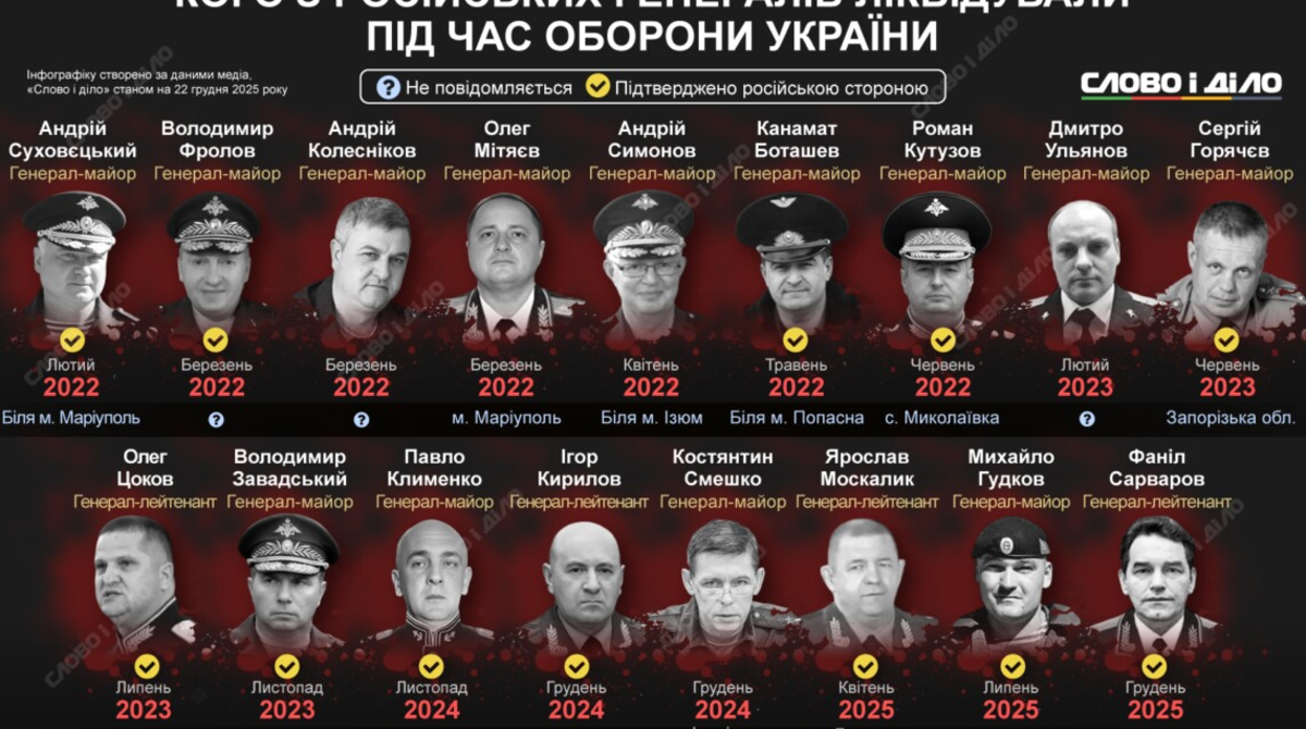 Перелік ліквідованих російських воєначальників поповнив керівник управління оперативної підготовки Міноборони рф Фаніл Сарваров. Його сьогодні вранці у власному авто підірвали у Москві. Від початку цього року це третій підтверджений російськими слідчими випадок загибелі генералів, а всього за майже чотири роки великої війни – дванадцятий. Ще низка випадків, коли ЗМІ повідомляли про загибель військового чиновника рф, потребує підтвердження. Імена російських генералів, яких було ліквідовано з 2022 по 2025 рік – на інфографіці «Слово і діло».
