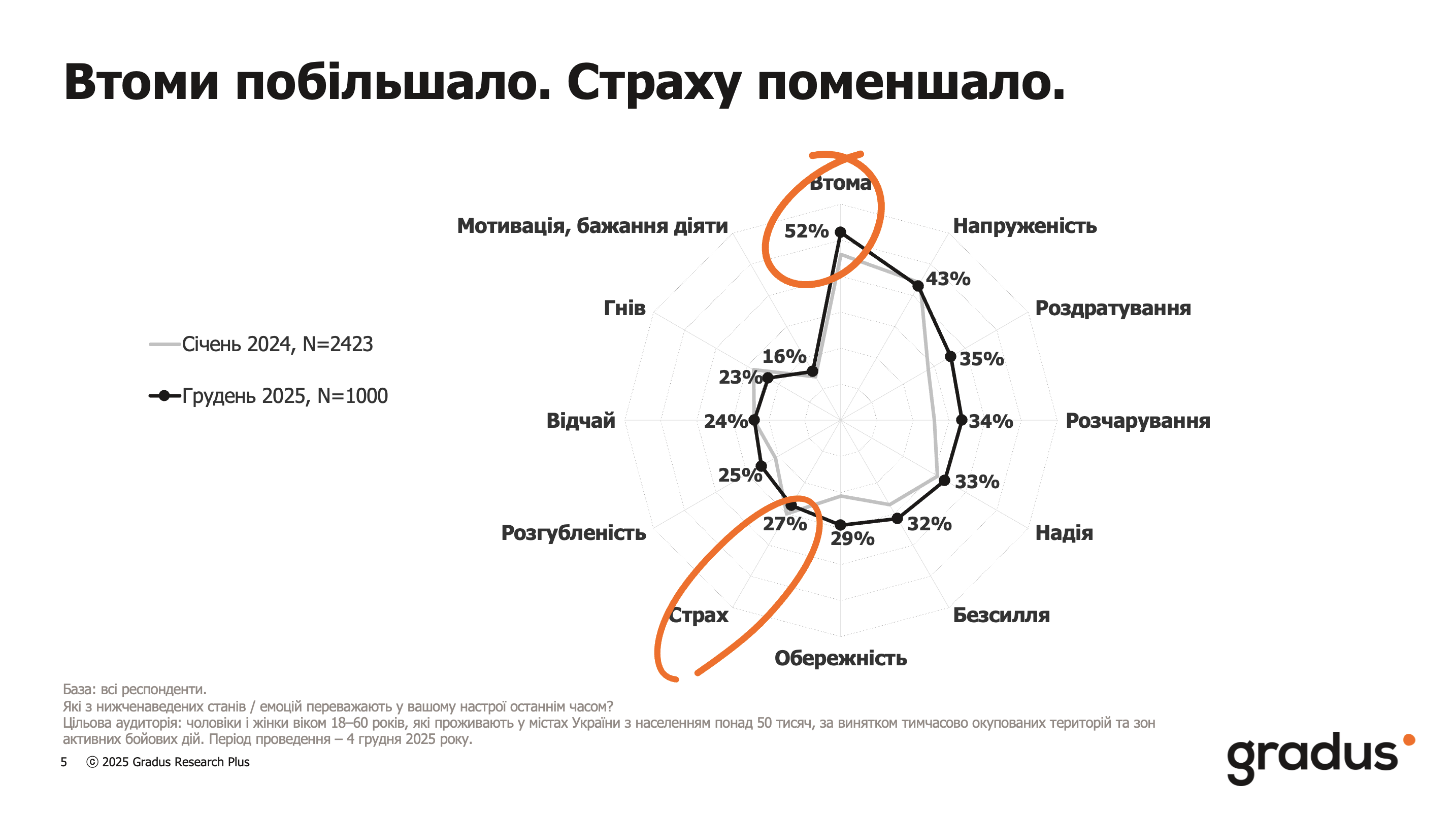 Дослідження зафіксувало погіршення психологічного стану населення. Частка тих, хто оцінює його як задовільний, знизилася з 36% у січні 2024 року до 29% у грудні 2025-го. У той же час рівень страху поступово знижується, а домінуючою емоцією стає втома – її найчастіше відчувають 52% опитаних.