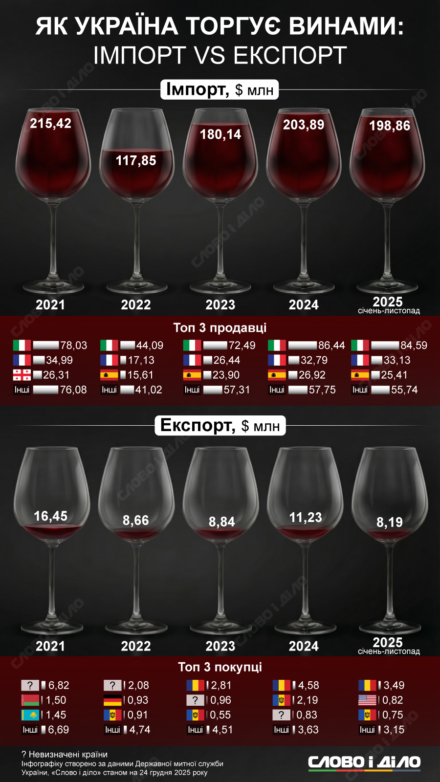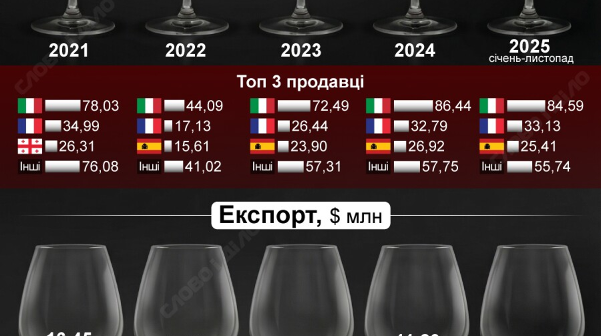 За 11 місяців поточного року Україна експортувала вина на понад 8 млн доларів. Значно більшими були обсяги імпорту святкового напою – майже на 199 млн доларів. ТОП-три країни, вино яких українці споживають найбільше протягом останніх чотирьох років – Італія, Франція та Іспанія. На інфографіці – скільки вина Україна продала та скільки придбала і з яких країн з 2021 по 2025 рік.
