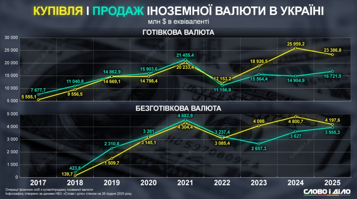 Обсяги купівлі іноземної валюти українцями цьогоріч були меншими, ніж у 2024 році. Водночас порівняно з роком раніше зріс обсяг продажу валюти, найбільше у готівковій формі – до 16,7 млрд доларів в еквіваленті. «Слово і діло» дослідило, як українці продавали та купували валюту до та під час повномасштабної війни з рф.