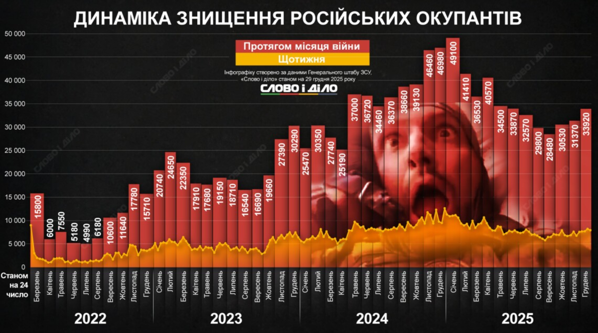 Ближче до кінця року на тлі загострення ситуації на фронті втрати армії рф знову почали зростати: листопад – 31 тисяча 370 вбитих, неповний грудень – 33 тисячі 920.