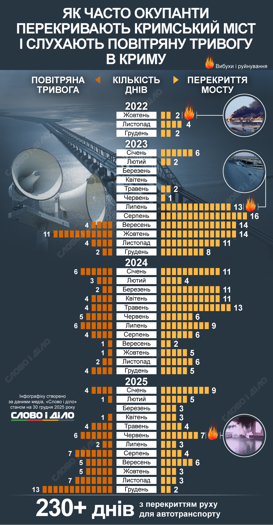 У 2025 році Кримський міст також тимчасово закривали щомісяця: у січні – 9 разів, лютому – 5, березні та квітні – по 3 рази, травні – 4 рази, червні – 7 разів.
