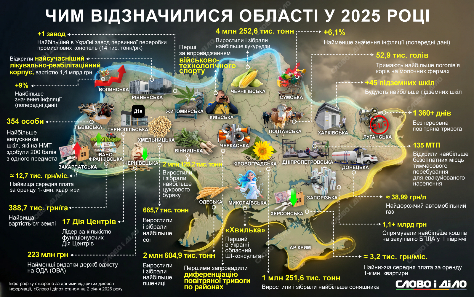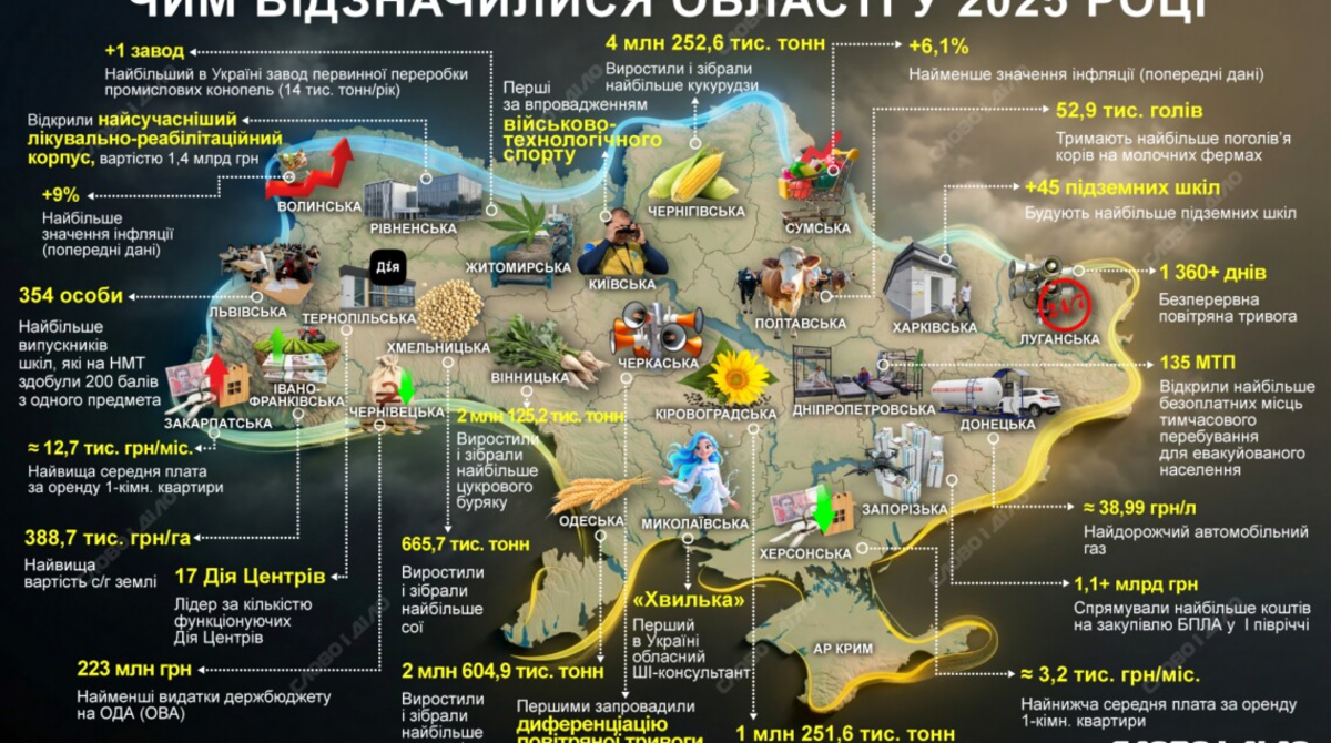 «Слово і діло» традиційно зібрало досягнення кожної області за підсумками року, який минув. Під час порівняння ми аналізували різні сфери: успіхи у сільському господарстві, ціни на оренду житла, пальне, досягнення у сфері ШІ тощо. На четвертий рік великої війни деякі рекорди, як і у попередні роки, не можна назвати позитивними, оскільки вони стосувалися безпосередньо вторгнення. Зокрема – найбільше днів повітряної тривоги або лідер за кількістю транзитних центрів для переселенців. Чим відзначилися регіони у 2025 році – на інфографіці.