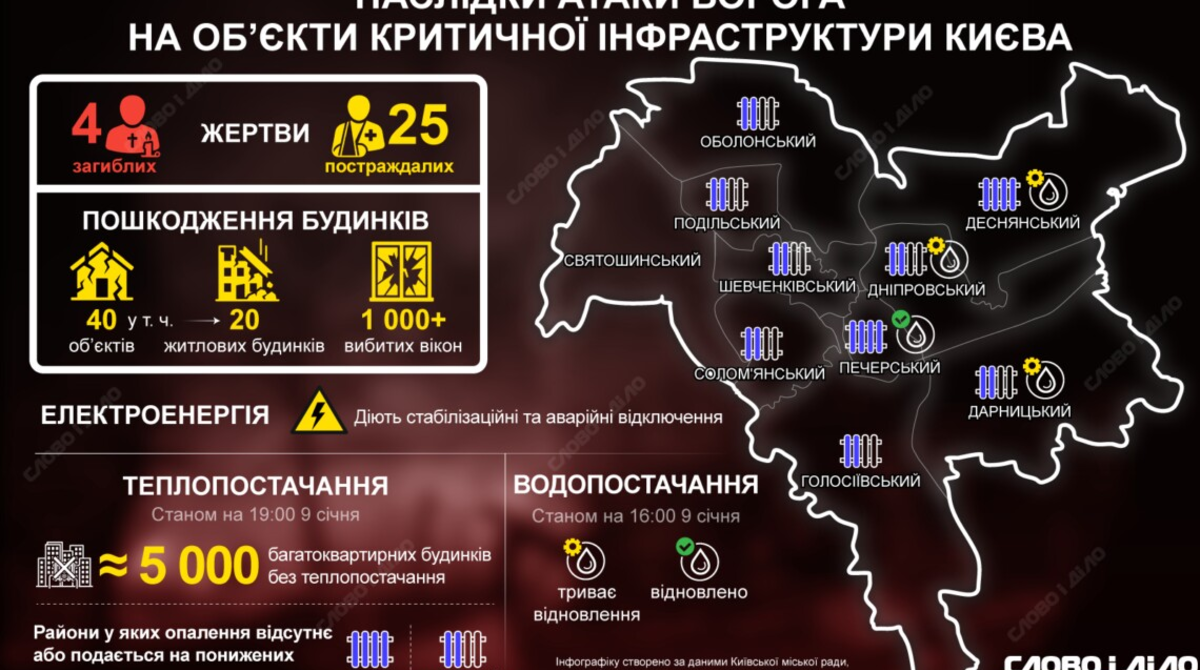 Через суттєві пошкодження об'єктів критичної інфраструктури у Києві близько 6 тисяч багатоквартирних будинків сьогодні залишилися без теплопостачання. Опалення відсутнє або подається на понижених параметрах у Деснянському та Печерському районах, такі ж проблеми у частини Голосіївського, Дарницького, Дніпровського, Оболонського, Подільського, Солом'янського та Шевченківського.