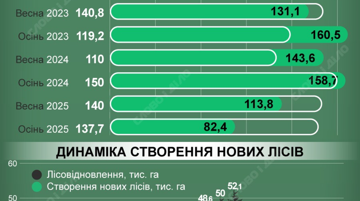 До запуску програми «Зелена країна» загальні площі лісовідновлення в Україні коливалися в межах 34–50 тис. га, один раз навіть перевищивши 50 тис. га на рік — у 2017-му. А створення нових лісів поступово знижувалося: з 30 тис. га у 2009 році до менш ніж 3 тис. га у 2020-му. Після старту програми ці показники зросли незначно: у 2023 році створили 5,9 тис. га нових лісів, у 2024-му – 6,2 тис. га. Дані щодо минулого року на сайті Держлісагентства поки відсутні.