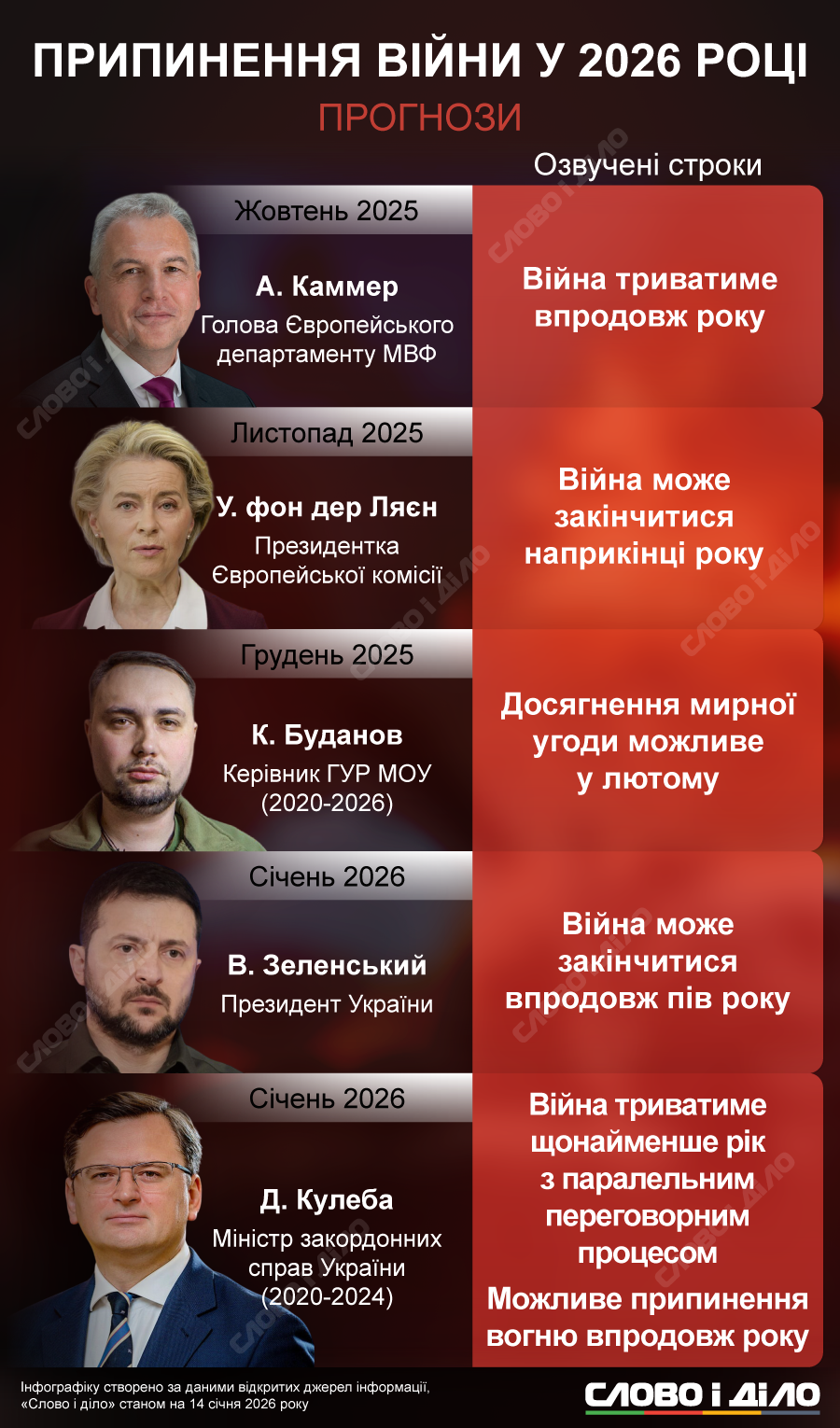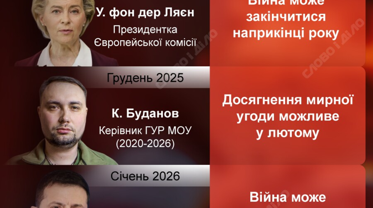 Найкоротший імовірний строк завершення війни минулого року озвучив на той час керівник ГУР Міноборони Кирило Буданов, який нині перебуває на посаді голови Офісу президента. У листопаді Буданов заявляв, що «вікно можливостей» для досягнення мирної угоди і завершення війни росії проти України може відкритися на початку або в середині лютого 2026 року. Однак, за його словами, без участі президента США Дональда Трампа досягти угоди буде вкрай важко.