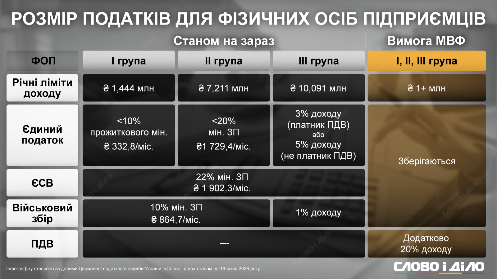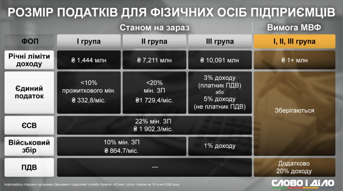 У грудні 2025 року Міністерство фінансів на вимогу МВФ представило для обговорення законопроєкт, який передбачає обов'язкову сплату ПДВ фізичними особами-підприємцями, чий річний дохід перевищує 1 млн грн. У Міністерстві зазначали, що очікують від сплати додаткових надходжень до бюджету близько 40 млрд грн на рік.