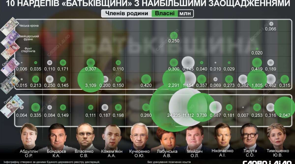 Заставу за лідерку «Батьківщини» Юлію Тимошенко, яку підозрюють у наданні хабаря народним депутатам, внесли поки що частково – 13,6 млн з понад 33 млн гривень. Сама Тимошенко вносити особисті кошти не планує, аргументуючи це тим, що таких сум вона не має. Гроші, за словами депутатки, нині шукає «вся команда, депутати, члени партії та всі регіональні структури». «Слово і діло» вирішило подивитися, хто з членів партії «Батьківщина» має найбільші задекларовані заощадження, які теоретично могли б допомогти запобігти арешту лідерки опозиції Тимошенко.