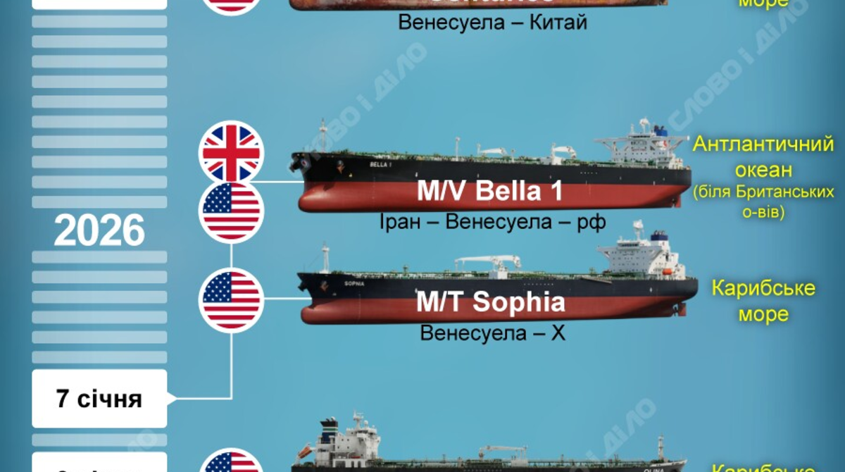 За півтора місяця американський спецназ затримав щонайменше сім танкерів «тіньового флоту». В одному випадку військовим США допомогла Британія, ще один танкер затримала Франція. Всі ці судна використовували підсанкційні країни, зокрема, рф, Іран, Венесуела, для обходу санкцій проти нафтової індустрії. Хронологія затримання нафтових підсанкційних танкерів у Карибському та Середземному морі, а також Атлантичному океані – на інфографіці.