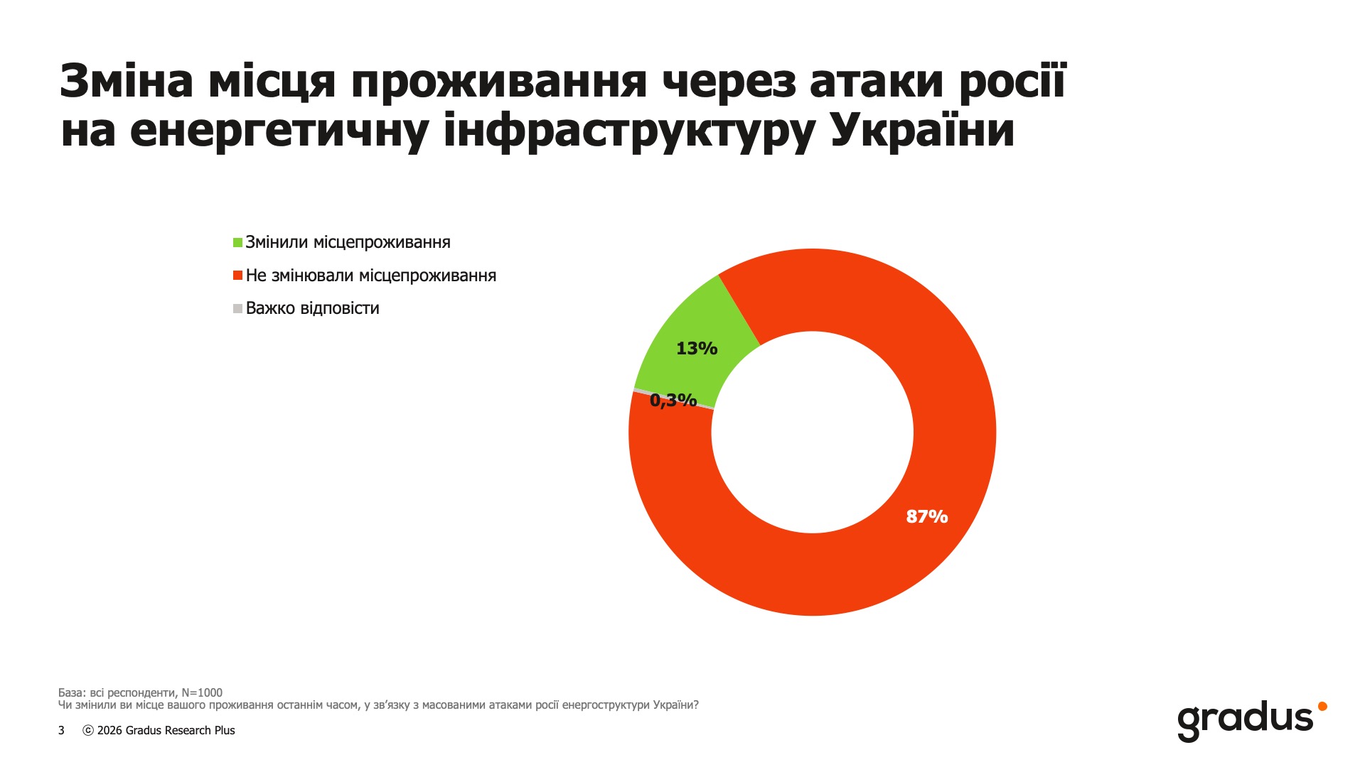 Згідно з опитуванням, 87% українців не змінювали місце проживання через перебої з електропостачанням, водою та опаленням. Лише 13% респондентів були змушені тимчасово переїхати внаслідок енергетичної кризи. При цьому 60% з них перемістилися в межах своєї області, а ще 50% в іншу область України, що свідчить про внутрішній характер переміщень.