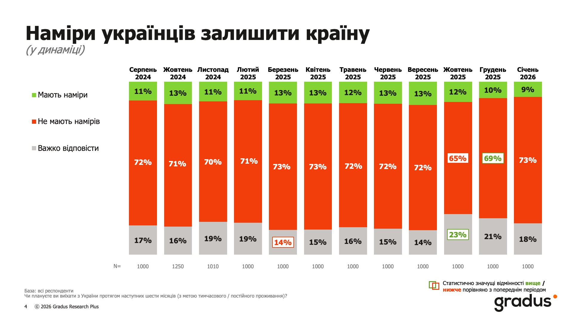 Опитування також показало, що лише 9% респондентів мають намір виїхати за кордон протягом найближчих шести місяців, і цей показник є найменшим за півтора року досліджень.