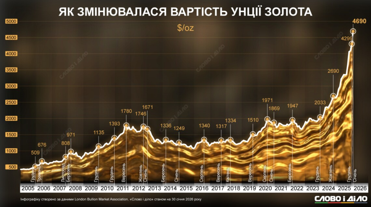 Ціни на золото цього місяця б'ють історичні рекорди. Останній зафіксували напередодні – 5 538 доларів за унцію, що є новим історичним максимумом. В цілому за два десятки років золото виросло у ціні в 11 разів. Як змінювалася середньомісячна вартість золота з 2005 по 2026 рік – на інфографіці.