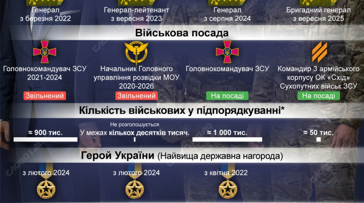 За останніми публічними даними, чисельність ЗСУ, яка нині у підпорядкуванні головкома Сирського, становить близько 880 тисяч військовослужбовців. При цьому дані щодо чисельності деяких силових структур залишаються засекреченими.